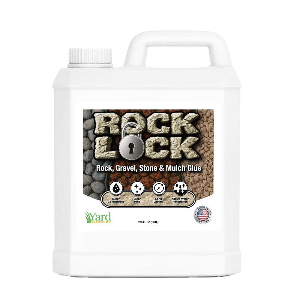 ROCK LOCK is a super-concentrated, water-permeable landscape adhesive that locks rock, gravel, stone, and mulch firmly in place — preventing erosion and displacement through rain, wind, UV, and seasonal temperature changes. One gallon makes two gallons of ready-to-spray formula.