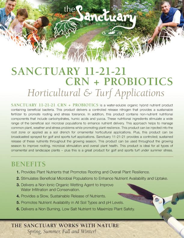 Sanctuary delivers a controlled release nitrogen that provides a sustainable fertilizer to promote rooting and stress tolerance. It can be used on lawns, landscapes and gardens to simulate beneficial microbes that enhance nutrient availability and nutrient uptake.